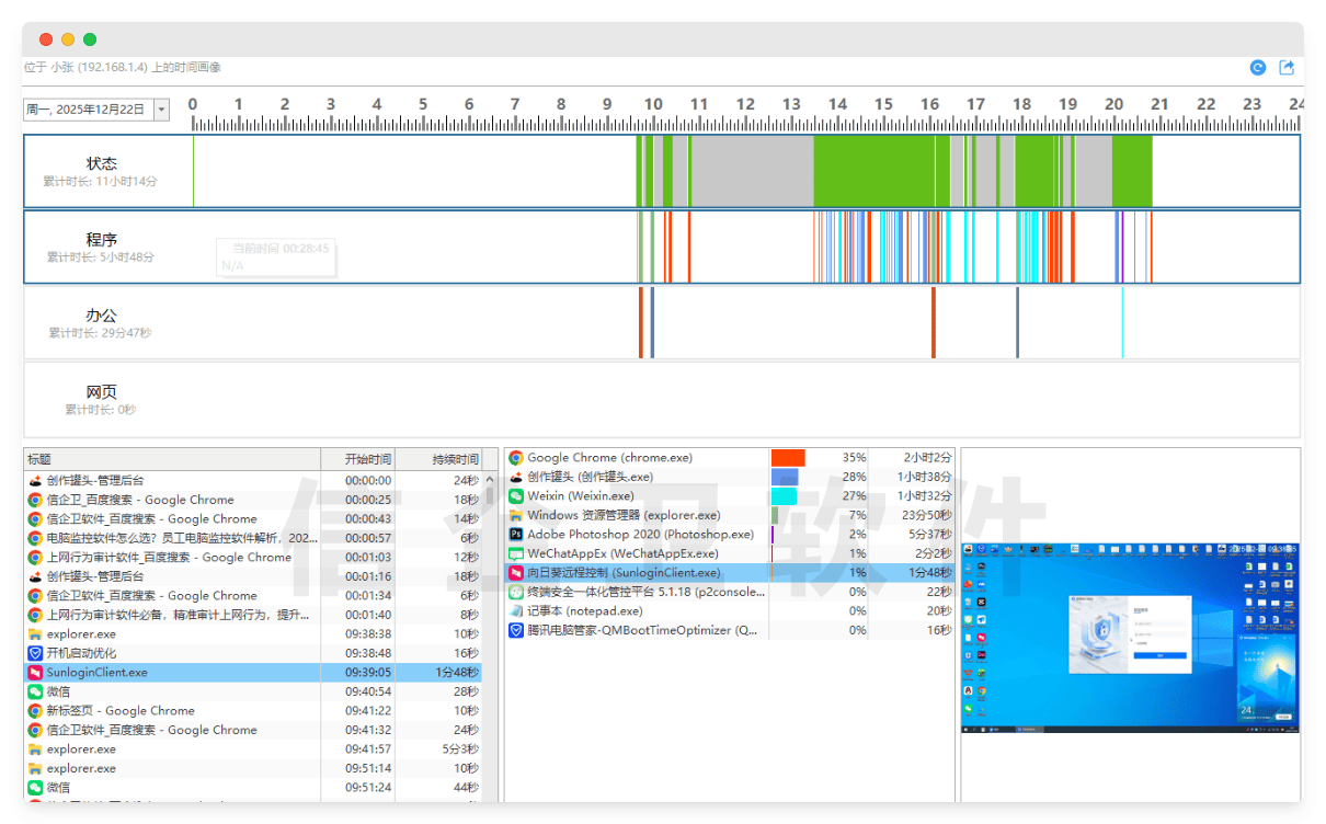 第五、霄汉巡弋:提供实时屏幕监控和历史回放功能,报表功能完善,支持按时间、操作类型统计终端活动,帮助管理者快速发现异常操作。