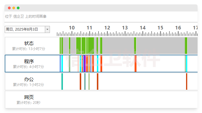 安装信企卫软件后,系统自动记录每台电脑的网页访问、软件使用和操作行为,并生成可视化图表。