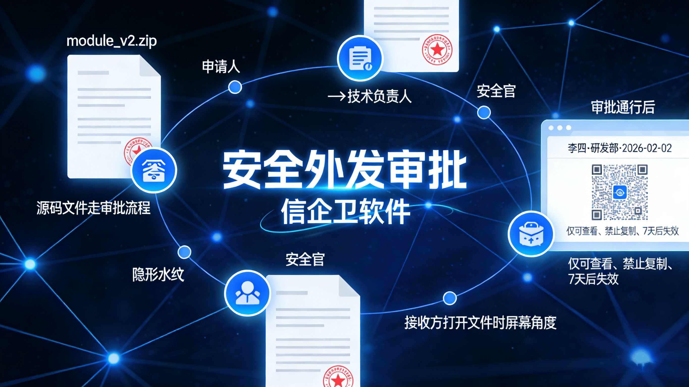安全外发审批:强制要求代码外发需通过审批流程,自动添加追踪水印,外发文件设置有效期与打开次数限制,防止二次传播。