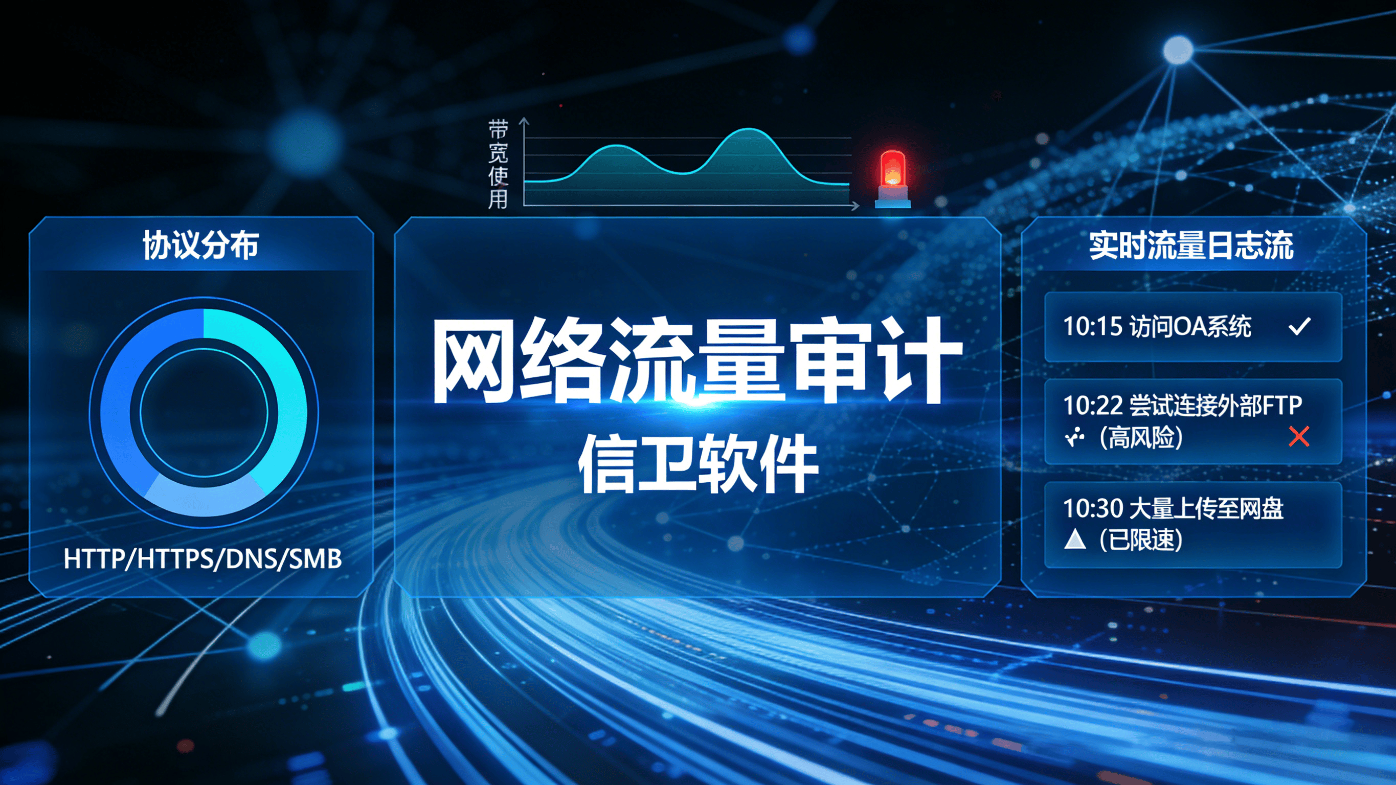 网络流量审计:深度解析HTTP、FTP、IM等协议流量,识别高风险行为(如访问非法网站、大文件外传),自动生成流量排名与异常告警。