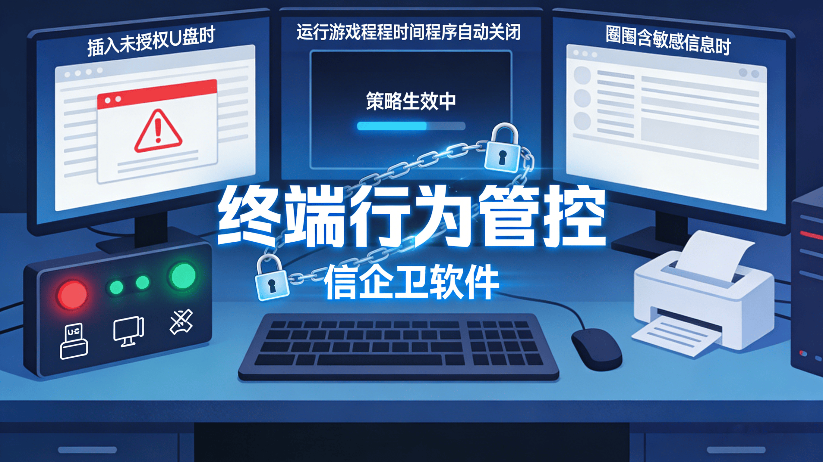 终端行为管控:禁止安装非授权软件、禁用USB等外设,并限制游戏、视频等娱乐应用,确保办公环境专注度与设备安全性。