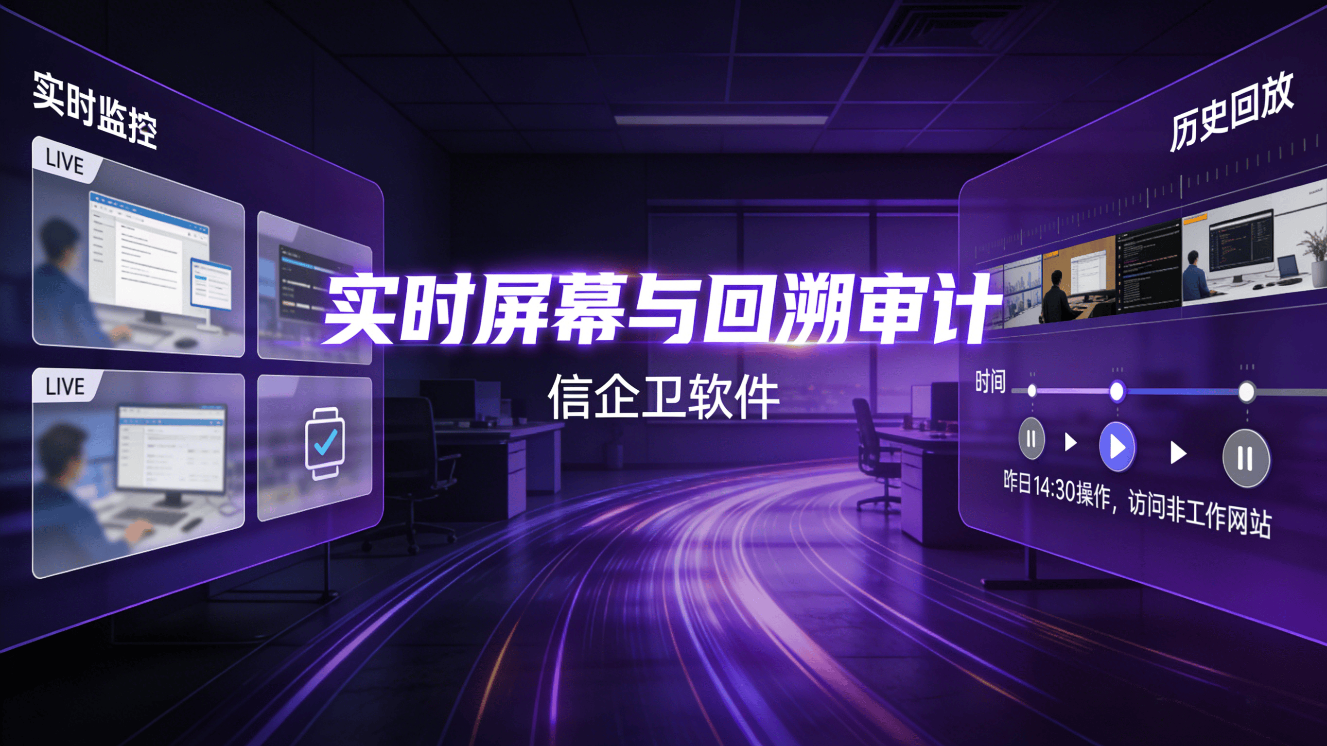 实时屏幕与回溯审计:支持多终端屏幕同步查看,实时监控员工操作,并可回溯任意时间段的操作路径,精准定位“摸鱼”行为。