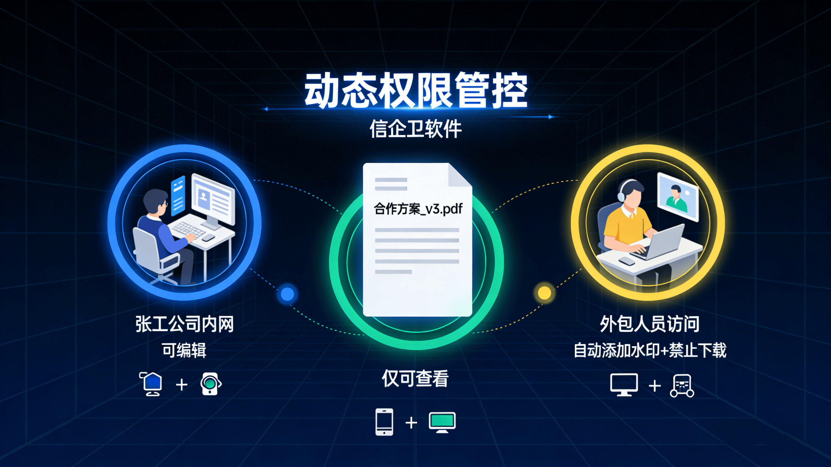 动态权限管控:支持按部门、岗位设置文件访问权限,结合时间、地点、设备等多维度条件,限制敏感数据外发,例如禁止研发人员将代码发送至个人邮箱。